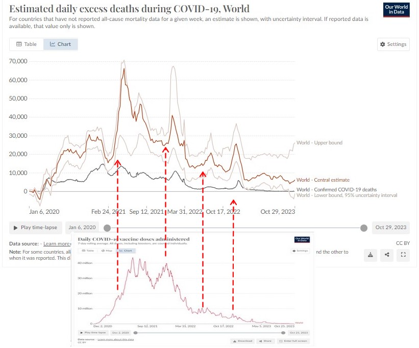 Surmortalité Mondiale + Mortalité Covid + Doses de vaccins callés au jour près Co-co-co- coïncidences Si les pics de vaccinations 3 et 4 semblent faibles n'oubliez pas qu'ils ne concernent quasiment que les plus âgés. Les plus jeunes ayant rarement fait + de 2 doses. https://t.co/v2qJ9oWf4X