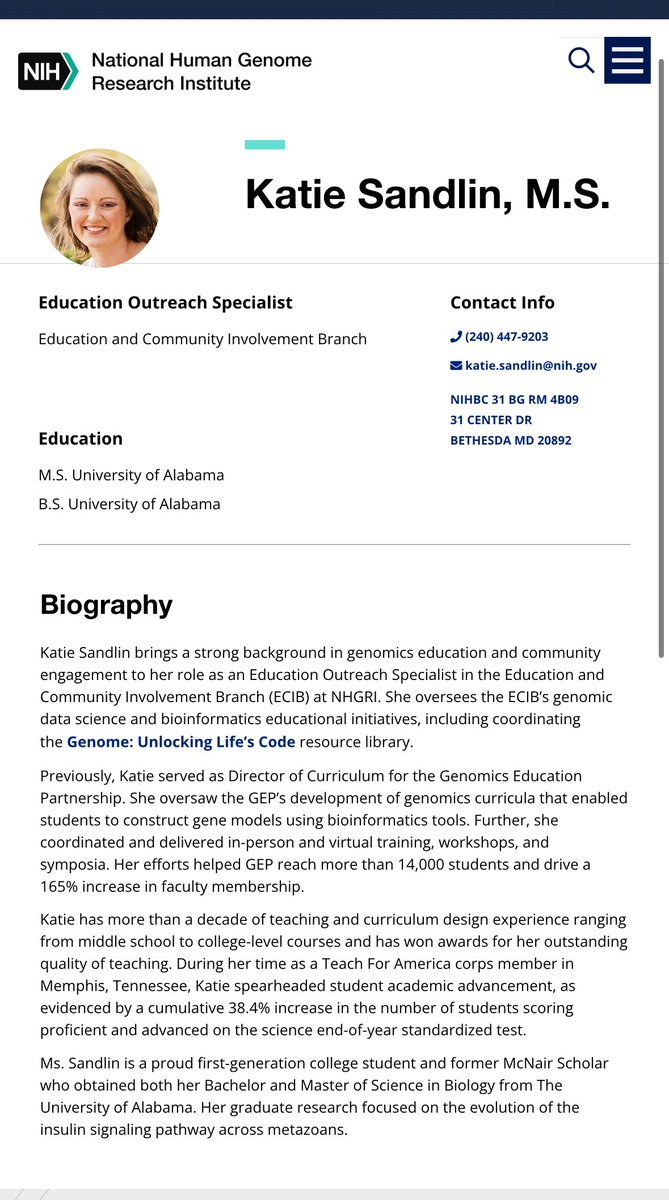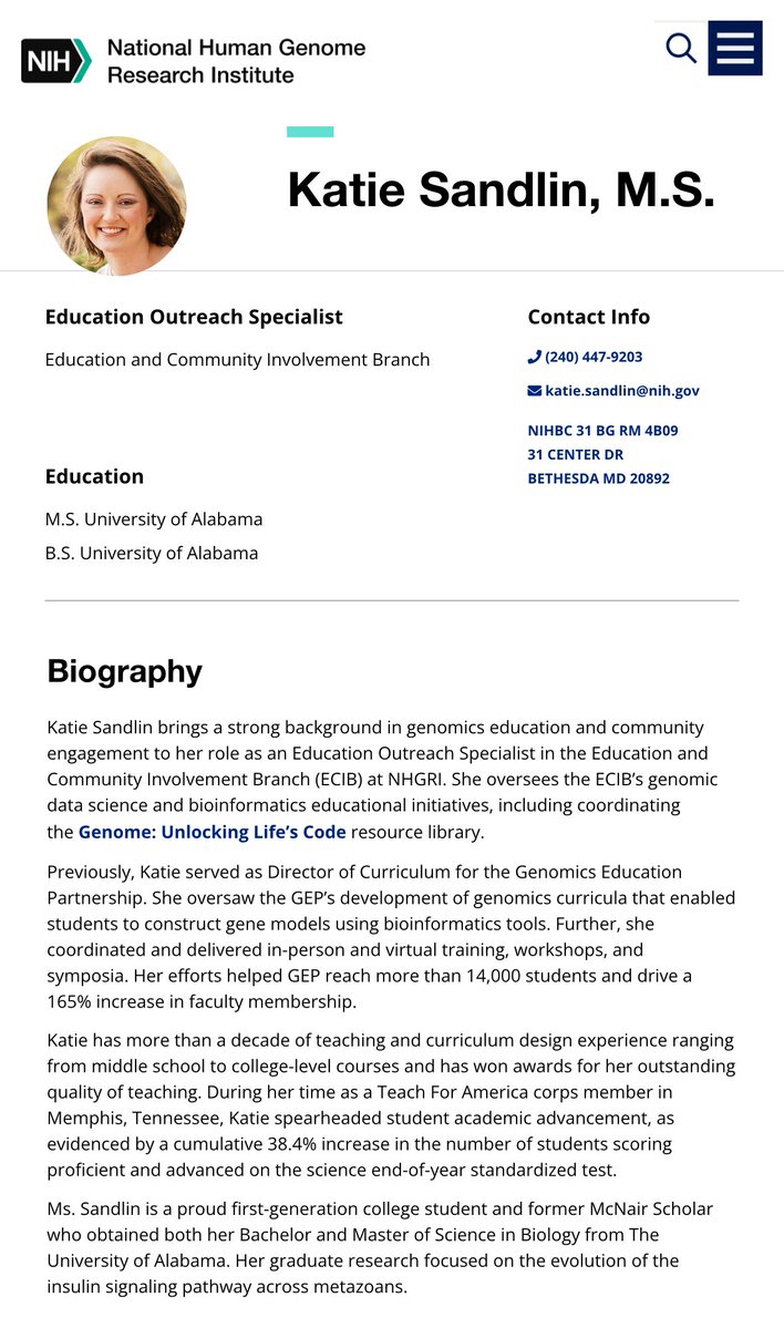@NIH @KatieMSandlin Also consider… the resources that @NIH devotes (spends money on) to creating an individual website bio for a brand new, probationary employee, who’s been on site for only 1 month… Not an executive, but an education outreach staff member You’d think she was an SES https://t.co/PPzy22vvfC
