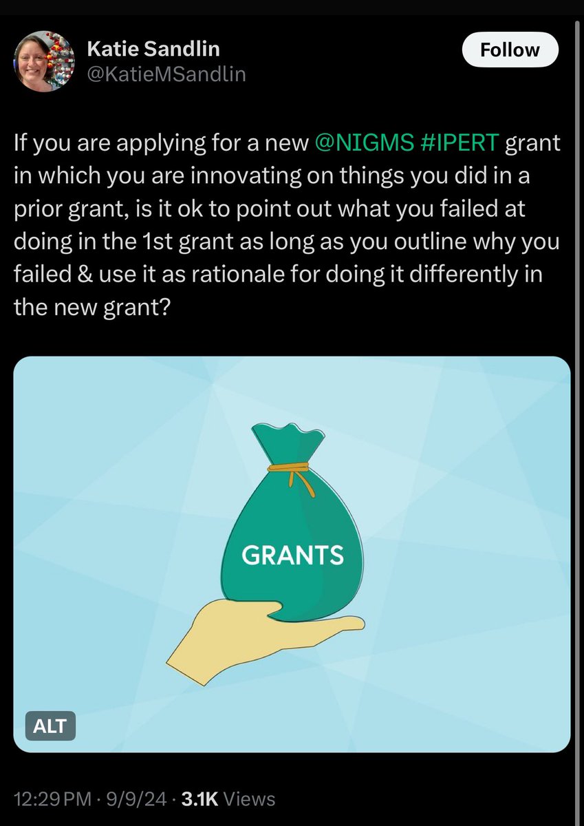 @NIH @KatieMSandlin @KatieMSandlin doesn’t tell you she’s brand new at NIH because she used to be employed at @GEP_CURE under an @NIGMS grant & that funding ran out ♻️ Katie doesn’t mention: “…is it ok to point out what you failed at doing in the 1st grant?” Maybe your performance IS THE ISSUE https://t.co/UzxGT77HxQ
