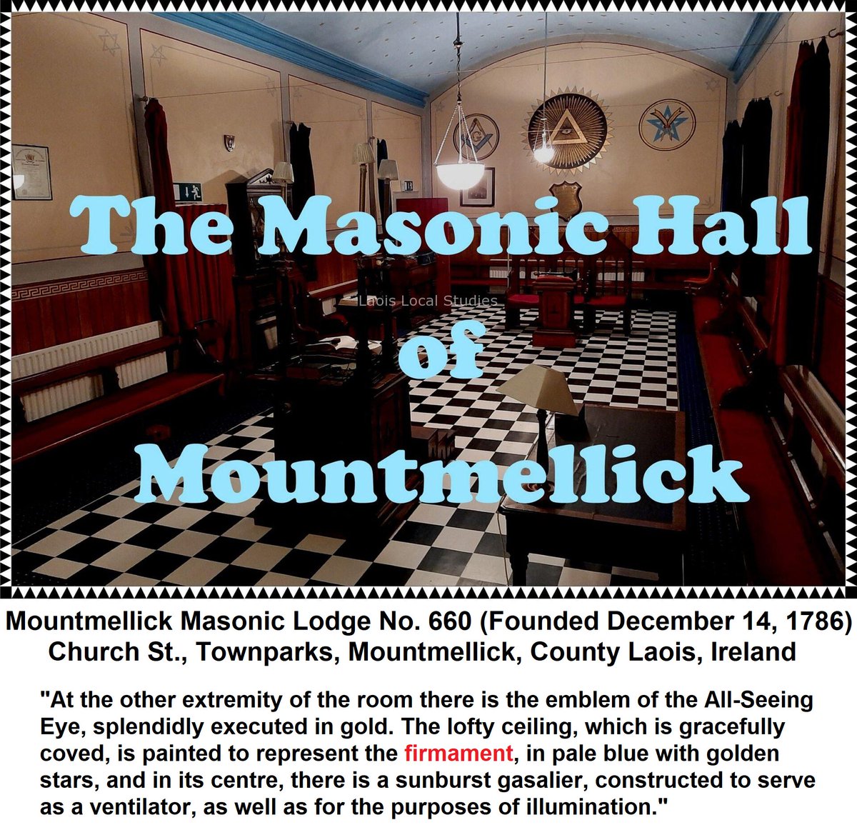 Mountmellick Masonic Lodge No. 660 Founded December 14, 1786 The official local Laois Library Service (@LaoisLibraries) openly admits the lodge ceiling was designed to represent the Earth's firmament: "At the other extremity of the room there is the emblem of the All-Seeing Eye, splendidly executed in gold. The lofty ceiling, which is gracefully coved, is painted to represent the firmament, in pale blue with golden stars, and in its centre, there is a sunburst gasalier, constructed to serve as a ventilator, as well as for the purposes of illumination." ๐ https://laoislocalstudies.ie/the-masonic-hall-of-mountmellick/ Located: Church St., Townparks, Mountmellick, County Laois, Ireland ๐บ๏ธ https://maps.app.goo.gl/3EmQLKvBr2Gsbsfy8 โ๏ธโ๏ธRead & Share The Full Articlesโ๏ธโ๏ธ ๐"The Earth Is Flat & Stationary: Destroying The Freemasonic Luciferian Globalist "Globe" Lie" ๐ https://www.humorousmathematics.com/post/the-earth-is-flat-stationary-destroying-the-freemasonic-luciferian-globalist-globe-lie ๐ "X-Factor Winner Reveals Worldwide Freemasonry Secretly Cloaks It's True Religion: Luciferianism" ๐ https://www.humorousmathematics.com/post/x-factor-winner-reveals-worldwide-freemasonry-secretly-cloaks-it-s-true-religion-luciferianism ๐ https://giveit.link/OperationQ