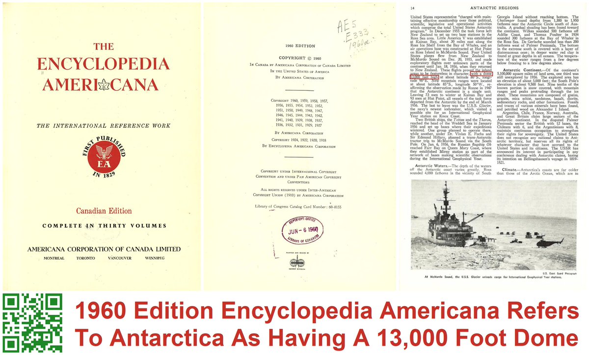 1960 Edition Encyclopedia Americana Refers To Antarctica As Having A 13,000 Foot Dome ๐๐ฆ๐ถ๐๐1โฃ9โฃ6โฃ0โฃ๐๐๐ฆ๐ถ๐ The 1960 Edition Encyclopedia Americana referred to Antarctica as having a 13,000 foot dome on page 14, also known as the firmament. The excerpt refers to an American Antarctic expedition from December 20, 1955 to January 18, 1956 to explore unknown landmasses in Antarctica. When they returned they concluded their expedition proved the inland featureless character of Antarctica with a dome 13,000 feet high at a latitude of 80ยฐS and longitude of 90ยฐE. Library of Congress (@librarycongress) Catalog Card Number: 60-8155 Acquired By @Scholastic: June 2000 ๐ Archive PDF: https://www.documentcloud.org/documents/23572221-antarctic_regions-1960-edition-of-the-encyclopedia-americana-v-2-pp-11-15 โ๏ธโ๏ธRead & Share The Full Articleโ๏ธโ๏ธ ๐"The Earth Is Flat & Stationary: Destroying The Freemasonic Luciferian Globalist "Globe" Lie" ๐ https://www.humorousmathematics.com/post/the-earth-is-flat-stationary-destroying-the-freemasonic-luciferian-globalist-globe-lie ๐ https://giveit.link/OperationQ