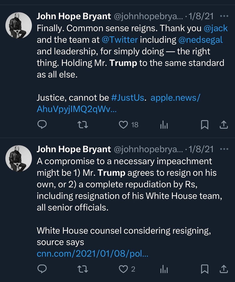 EXCLUSIVE: โผ๏ธ WHITE HOUSE VETTING CRISIS CONTINUES AS TRUMP APPOINTED US TREASURY SECRETARY INVITES PRO- IMPEACHMENT TRUMP HATER TO COLLABORATE WITH HIM AT THE TREASURY DEPARTMENT โผ๏ธ Scott Bessent invites pro-impeachment and pro-censorship Trump hater to collaborate with him at the @USTreasury. ๐จTrump appointed US Treasury Secretary Scott Bessent @SecScottBessent invited Rabid Trump hater John Hope Bryant to work with him at the US Treasury despite John Hope Bryantโs public praise of former Twitter CEO Jack Dorsey @Jack for banning President Trumpโs X account on January 8, 2021 after J6. ๐จ Bessent called @johnhopebryant his โlongtime friendโ in the X post below on 4/3/25. Hereโs the evidence that John Hope Bryant celebrated the deplatforming of President Trump, and called for @realDonaldTrump @potus to be IMPEACHED 2 days after J6. John Hope Bryant also called on Trump to RESIGN after J6, but he has since been brought into the Trump admin by his good friend Scott Bessent. I am going to personally tell President Trump and personally show him these receipts. This is another egregious Trump admin VETTING FAILURE that puts President Trump at risk. Shame on @SecScottBessent.