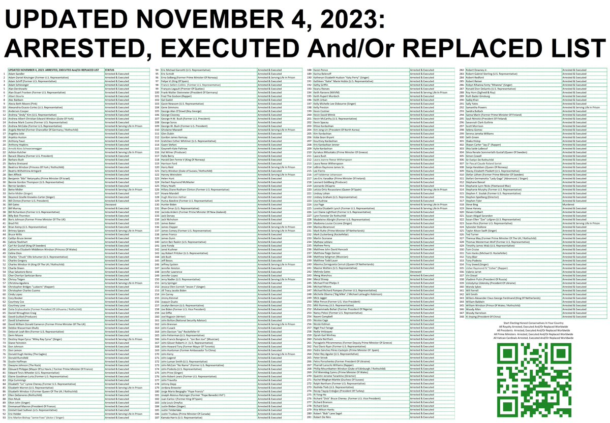 UPDATED NOVEMBER 4, 2023: ARRESTED, EXECUTED And/Or REPLACED LIST โ๏ธโ๏ธโ๏ธโ๏ธโ๏ธโ๏ธโ๏ธโ๏ธโ๏ธโ๏ธโ๏ธ To honor the 3 year anniversary of my GITMO list and an abundance of requests for an update over the years, I have put together the following alphabetized updated (@msexcel) list based on the intel updates provided by military and royalty connected sources on @X including: Ariel (@Prolotario1), ลitecoin Bull | The News Before The News! (@litecoin_bull), THE REAL DARK JUDGE (@ROYALMRBADNEWS) and WarNuse (@WarNuse). Keep in mind there are thousands of names not mentioned here which does not necessarily mean they were not arrested, executed and/or replaced yet; although there are continuous additional military tribunals ongoing. ๐ Excel Document: https://dbree.org/v/41cc8d โ๏ธโ๏ธRead & Share The Full Articleโ๏ธโ๏ธ ๐"Mid-2020 GITMO Update: Arrests, Indictments, & Executions" ๐ https://www.humorousmathematics.com/post/mid-2020-gitmo-update-arrests-indictments-executions ๐ https://giveit.link/OperationQ