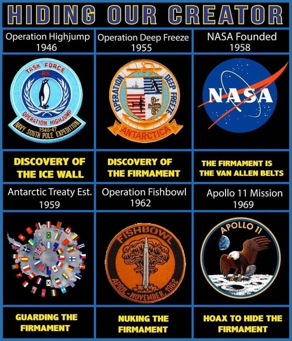 Op Highjump (1946) Ice Wall Discovery Op Deep Freeze (1955) Firmament Discovery @NASA Founded (1958) Firmament Is Van Allen Belts Antarctic Treaty (1959) Guarding Firmament Op Fishbowl (1962) Nuking Firmament Apollo 11 (July, 1969) Hide Firmament Hoax ๐ https://humorousmathematics.com/post/the-earth-is-flat-stationary-destroying-the-freemasonic-luciferian-globalist-globe-lie