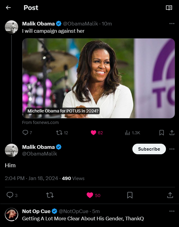 Two Male Obama Candidates In 2024? ๐คต๐ฟ๐ณ๏ธ๐คต๐ฟ๐ณ๏ธ2โฃ0โฃ2โฃ4โฃ๐ณ๏ธ๐คต๐ฟ๐ณ๏ธ๐คต๐ฟ On January 18, 2024 Malik Obama (@ObamaMalik) provided more clarity about Big Mike's (@MichelleObama's) gender after accidentally using the wrong pronoun when mentioning he would campaign against him. He promptly made the correction that he meant to use "him" rather than "her." It is imperative to note that Big Mike was already executed and replaced so him running for president would be another White Hat controlled shadow presidency gimmick, just like fake Bidan's. ๐ Link To Malik Obama's Tweet: โ๏ธโ๏ธRead & Share The Full Articleโ๏ธโ๏ธ ๐"Michael LaVaughn Robinson: Deep State Satanic NWO Tranny, Also Known As Michelle Obama" ๐ https://www.humorousmathematics.com/post/michael-lavaughn-robinson-deep-state-satanic-nwo-tranny-also-known-as-michelle-obama ๐ https://giveit.link/OperationQ