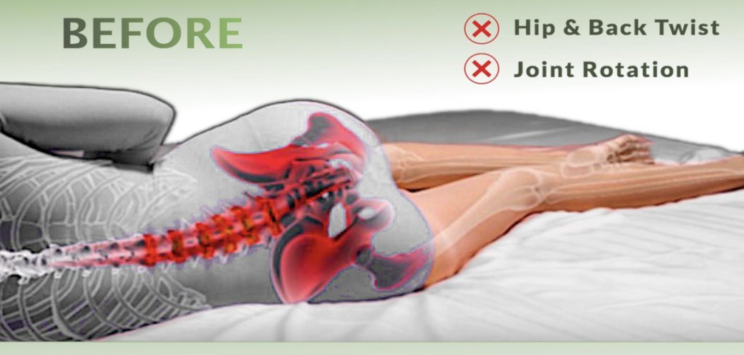 2. The upper leg tends to fall forward, pulling on the outer thigh (iliotibial band) all night, like tugging on a loose rope. This can also rotate the pelvis and spine. Result? Muscle pain, hip stiffness, and knee pain.