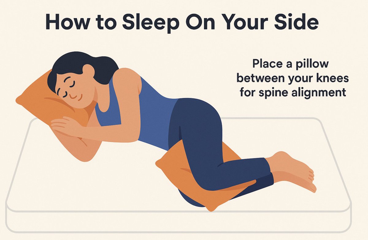 How to sleep on your side like a pro: • Use a pillow with the right height to keep your neck aligned with your spine. • Place a pillow between your knees to keep your hips aligned. • Consider using a body pillow to support both your arm and leg. • Turn your head occasionally to balance the pressure.
