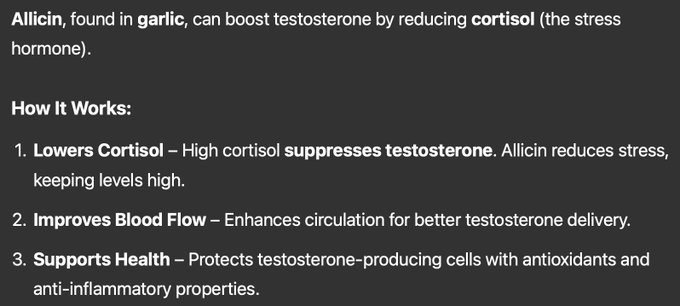 3. Garlic High stress lowers testosterone. That’s where garlic steps in. It contains allicin, a compound that reduces cortisol levels. Here’s how it helps boost testosterone: