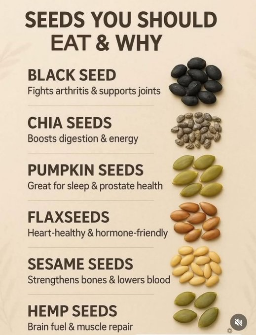 1) Seeds Tiny but mighty, seeds are packed with omega-3 fatty acids that ease inflammation. They also support: • Joint health • Heart health • Healthy cholesterol Toss them into smoothies, salads, or soups.