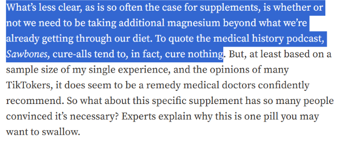 “Magnesium supplements—especially glycinate—are often treated like a miracle in a bottle. But as one medical podcast put it: ‘cure-alls tend to, in fact, cure nothing.’” - Sawbones, The Medical History Podcast