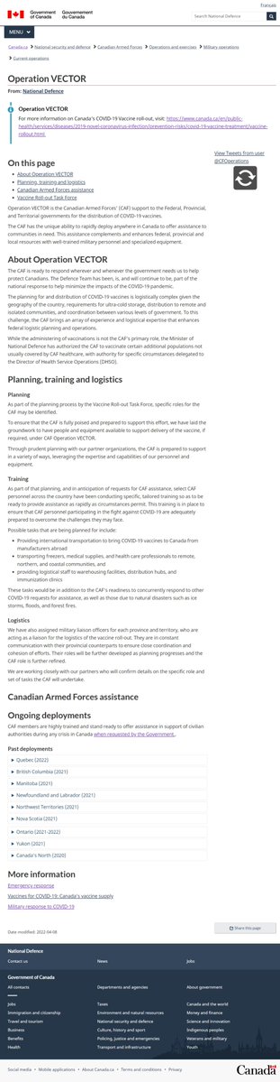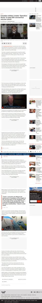 @ChatterBox_Muse Canadian military creates ‘Operation Vector’/help with coronavirus vaccine rollout. By Lee Berthiaume Dec. 3, 2020 CAF rec'd formal orders/distribution of COVID-19 vaccines,/military’s top commander/order contained/ planning directive/chief defence staff Gen. Jonathan Vance. https://t.co/1fbKqjj6IO