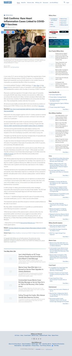 @belligerentNuck 🚨 Military News DoD Confirms: Rare Heart Inflammation Cases Linked to COVID-19 Vaccines 30 Jun 2021 http://Military.com | By Patricia Kime A new study of U.S. service members found higher than expected rates of heart inflammation following receipt of COVID-19 vaccines.