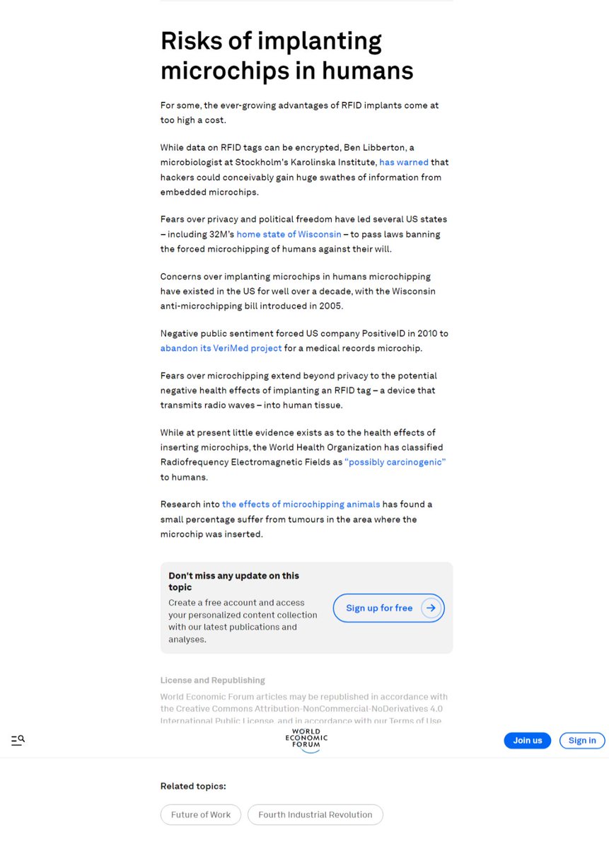 @MysticBiker WEF Site // "While at present little evidence exists as to the health effects of inserting microchips, the World Health Organization has classified Radiofrequency Electromagnetic Fields as “possibly carcinogenic” to humans." https://www.weforum.org/agenda/2017/08/microchip-in-your-hand-rfid-32m/