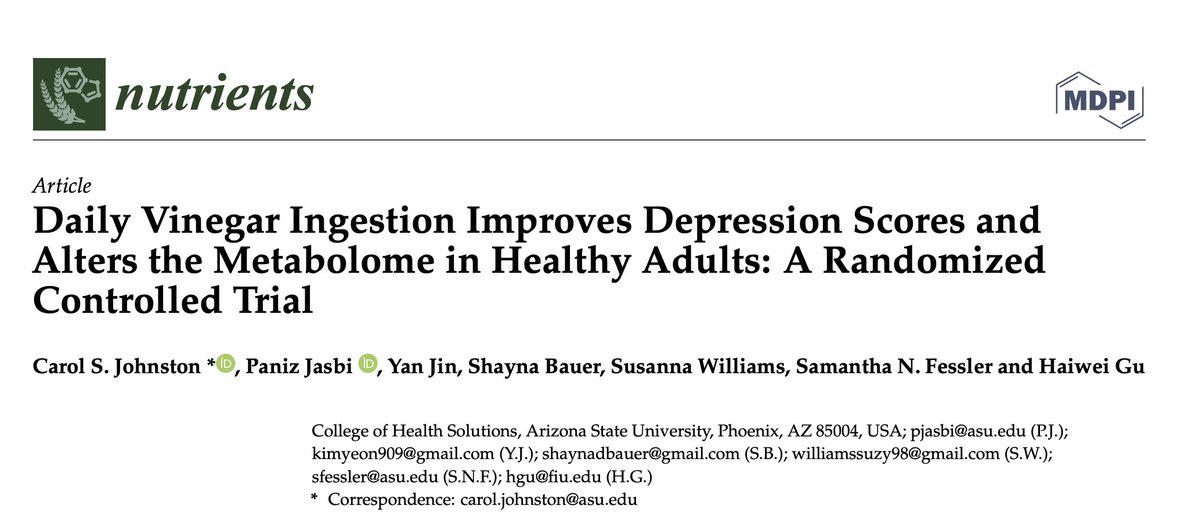 This study came out in 2021 in the journal of Nutrients. Vinegar has several beneficial effects metabolically. Metabolism and mood are deeply intertwined - so researchers sought to find out if vinegar had direct antidepressant qualities. (2/8)