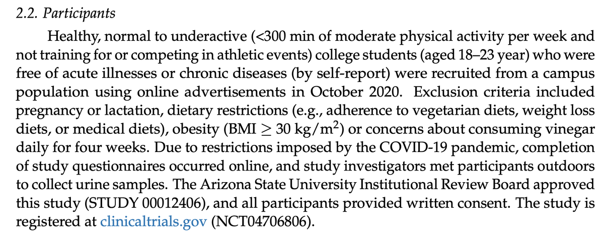 Participants were college students. They also excluded obese individuals, or anyone with other underlying illness. Thus, the population was already relatively young and healthy - meaning any effect of vinegar had to be strong in order to move the needle. (3/8)