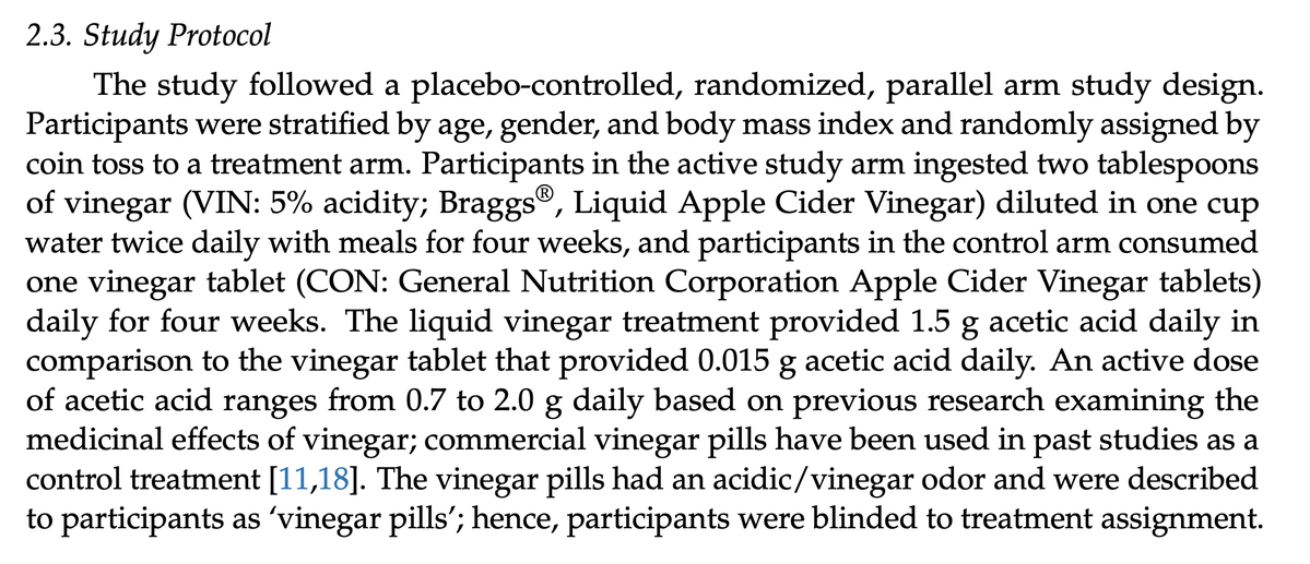 The vinegar group consumed: ➜ 2 tablespoons of apple cider vinegar (Bragg's) ➜ Dissolved in a cup of water ➜ Twice daily ➜ With meals ➜ For 4 weeks Participants were randomized and the control group was given very low dose "vinegar pills" - so they wouldn't know they were in the placebo group. (4/8)