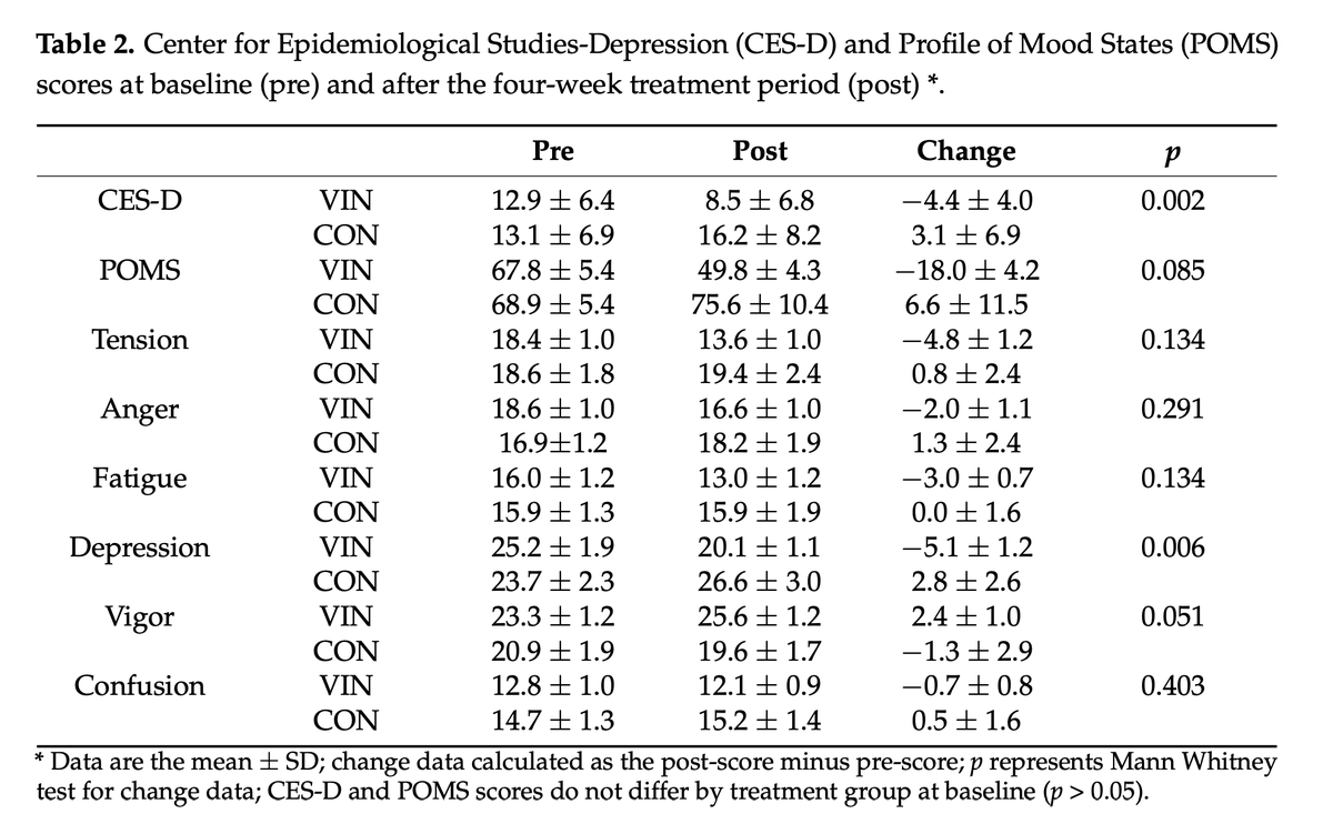 Vinegar also seemed to (though not "statistically" significant): ◇ Improve overall mood ◇ Reduce tension ◇ Reduce anger ◇ Reduce fatigue ◇ Improve vigor Pretty incredible for something so ubiquitous and cheap. (6/8)