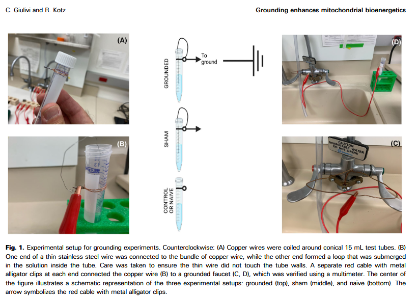 This was done by experimenting with isolated mitochondria. They measured how much energy mitochondria could output and how much oxidative stress they would be under. To ground, they literally stuck steel wiring into the tubes with the mitochondria, which connected to the ground via copper wiring. A control group had the wiring but no connection to the ground. (3/7)