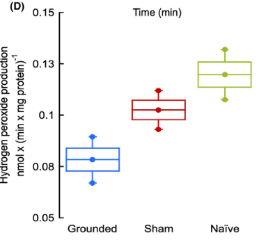 Under active energy production conditions, grounding also lowered oxidative stress (hydrogen peroxide production). Typically when energy production is up we think of the mitochondria putting out more reactive oxygen species. Grounding improves both. (6/7) https://t.co/rTPLceMK7w