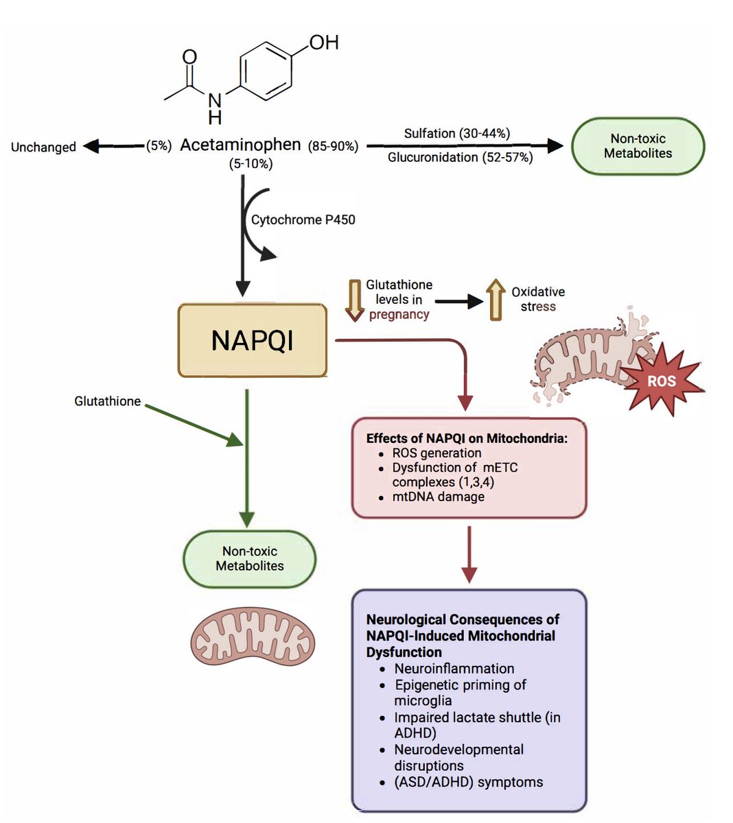 The main problem with Tylenol lies in its metabolism. Only a fraction of Tylenol gets excreted, the vast majority of it undergoes enzymatic detoxification. This requires: ➥ Sulfate ➥ Glutathione and can form a highly toxic compound called NAPQI - which poisons mitochondria and leads to tons of DNA damage and oxidative stress. This is one of the reasons it damages the liver, but it does this in the brain as well. Glutathione and sulfate are needed for other functions as well, and their levels are often low in autism. (6/11)