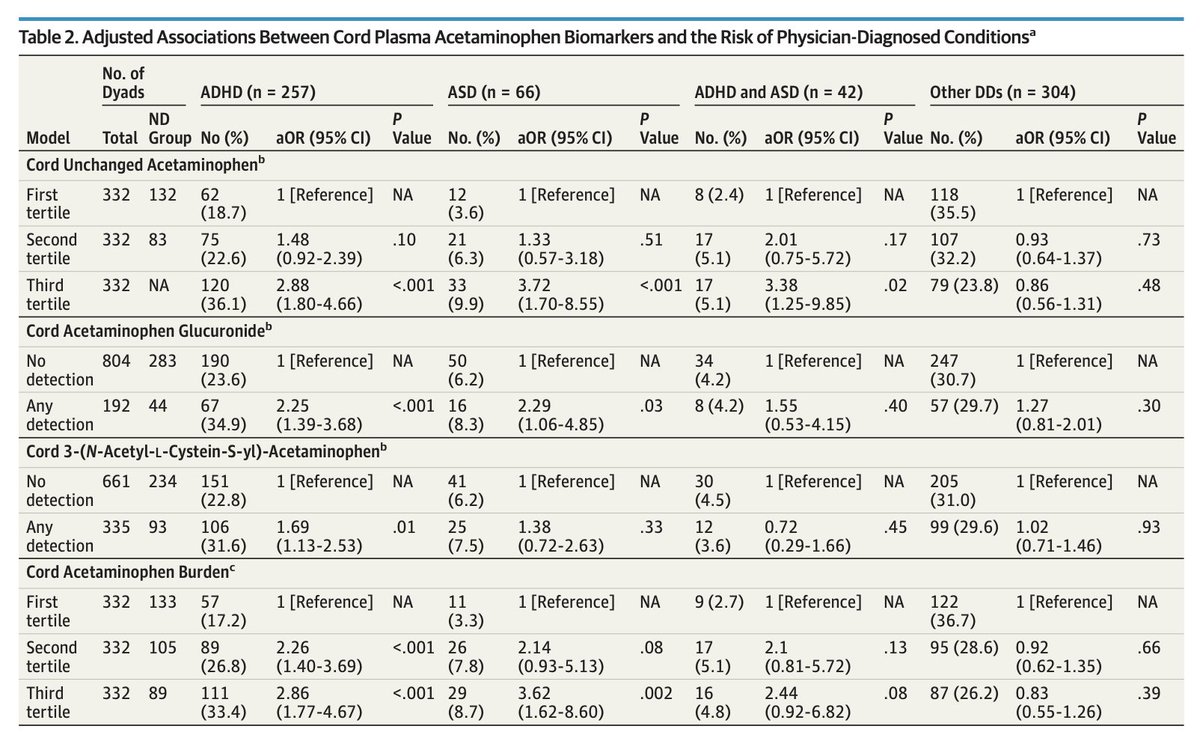 One of the most compelling studies on the topic was published in JAMA in 2019. They measured Tylenol and its metabolites in umbilical cord plasma, showing a: ◇ ~3X increase risk in ADHD ◇ 3-4X increase risk in autism in children. Again, they made sure to adjust for confounders, including maternal illness. (8/11)