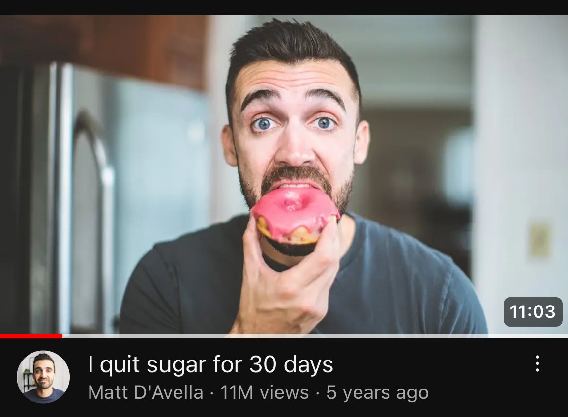 So what do we learn? Well, people who say they stopped eating sugar and feel better: ⬩Go into it thinking sugar is bad, so when they get better they confirm this bias (or don't get better but say they do bc of cultural conditioning) ⬩Stop eating a lot of food additives that are horrible for the gut ⬩Start being mindful of what they're eating ⬩Start eating more nutrients + protein ⬩Change other lifestyle factors ⬩Think their cravings are bad but don't get rid of them when they cut sugar ⬩Might lose weight from eating less in general, which everyone likes