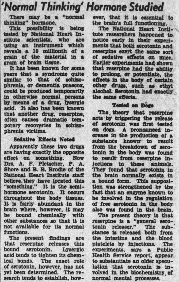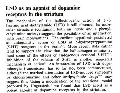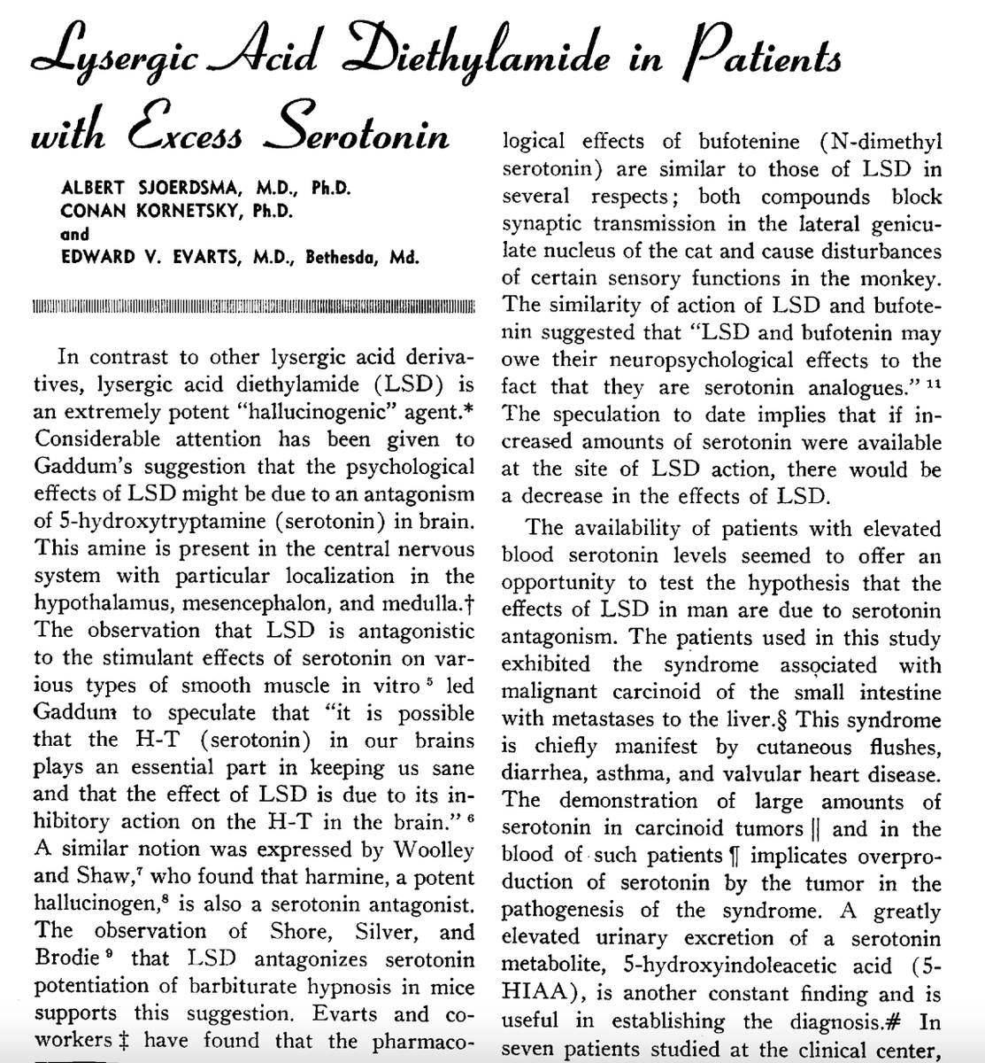 LSD, at lower doses, has been shown to inhibit the firing of serotonergic neurons, the release of serotonin, and functionally antagonize serotonin. It also seems to have a pro dopamine effect. Clearly, the framing of calling serotonin a “normal thinking hormone” was conditioning.