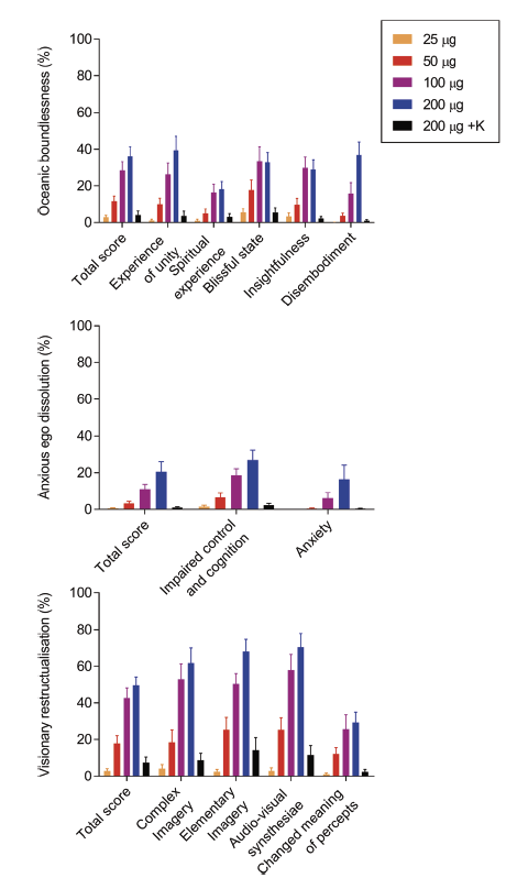 but the hallucinations of LSD at higher doses comes from ACTIVATING a serotonin receptor. Inhibiting that receptor or lower doses abolish the negative effects of LSD. Bad trips: the fear, ego death and horrifying visuals are really driven by serotonin.