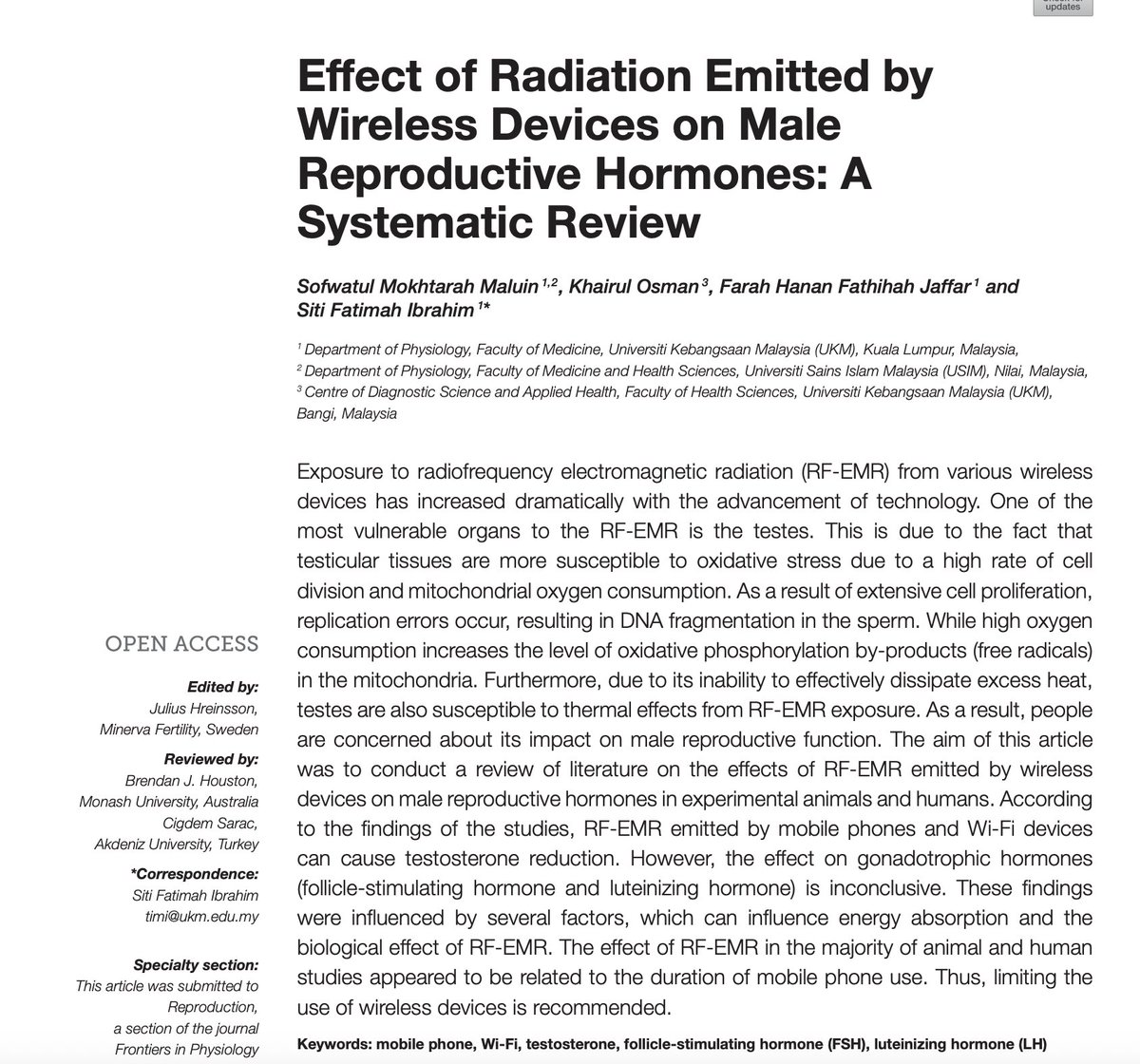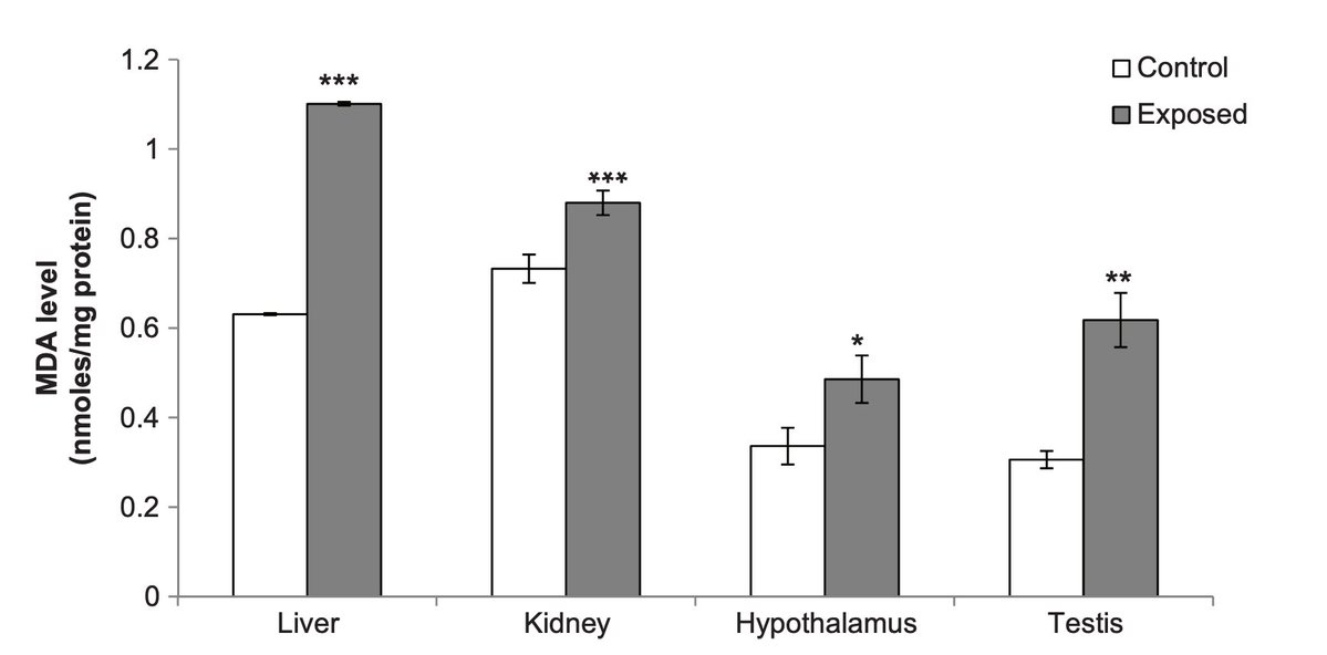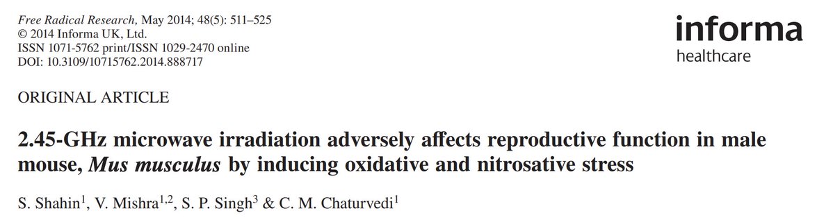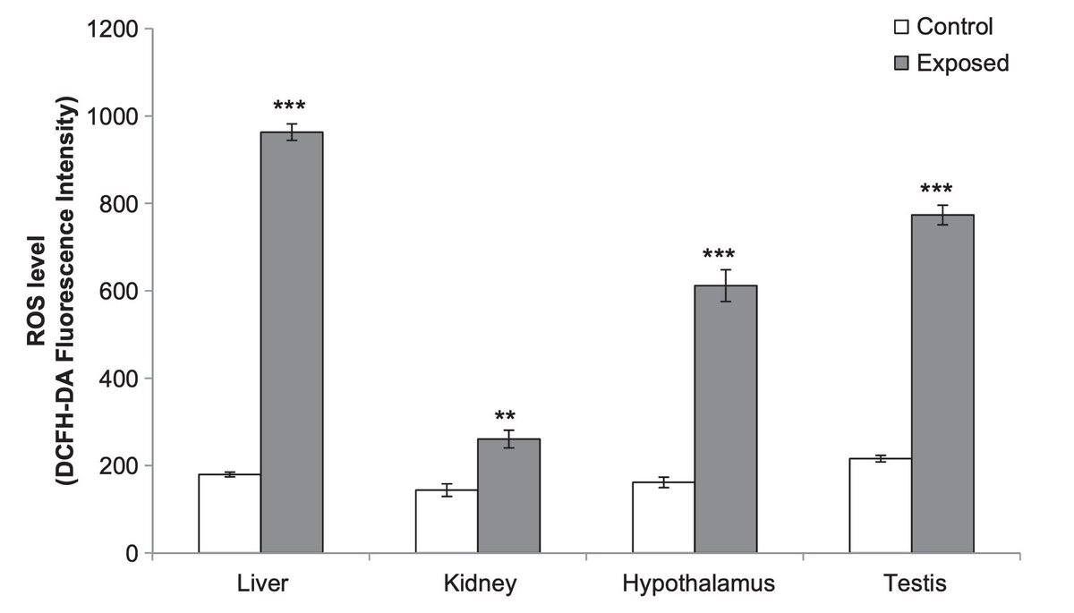 Wi-Fi was able to do this by inducing oxidative and nitrosative stress. Essentially, it causes the production of small but highly reactive molecules made of oxygen and nitrogen. These can cause damage to tissues and alter hormonal / signaling functions. (5/7) https://t.co/I3imeUsXQ2