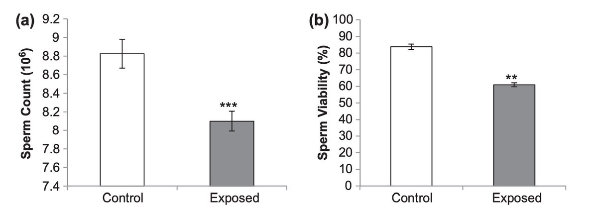 Wi-Fi also worsened sperm health. Both sperm count and viability were reduced with exposure. Previous studies showed that they could cause DNA damage in these cells, and even hypothesized that putting a laptop on your lap could directly cause this. (4/7) https://t.co/Gz4y4IgitY