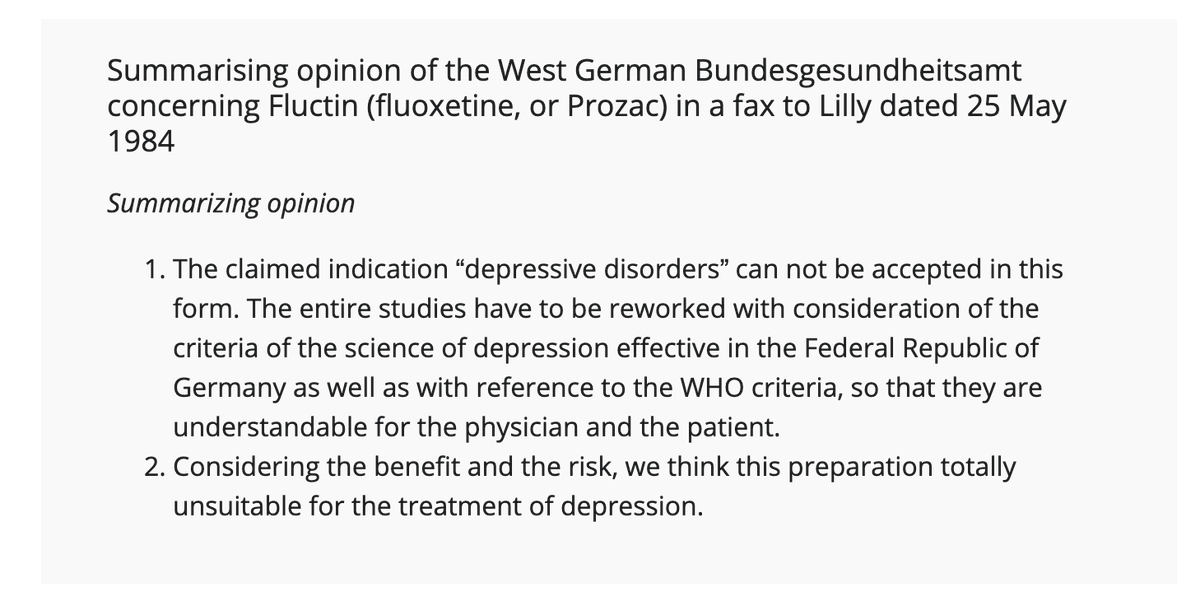 Lilly first tried to get Prozac approved in Germany, with their drug regulatory agency saying in a fax back to Lilly that “we think this preparation totally unsuitable for the treatment of depression.”