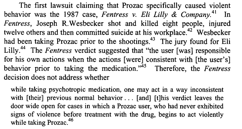 Several other trials were held about similar issues: people starting to take SSRIs and then killing others and/or themselves. By this point it didn’t matter. Prozac was a top 5 selling drug and was raking in billions. Paying off a few million to some families was well worth it.