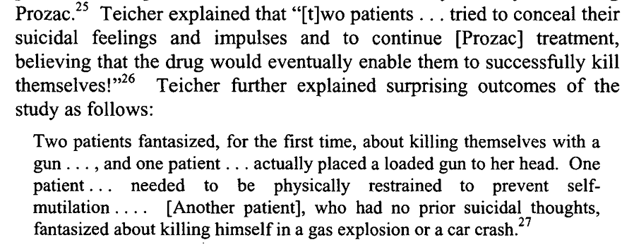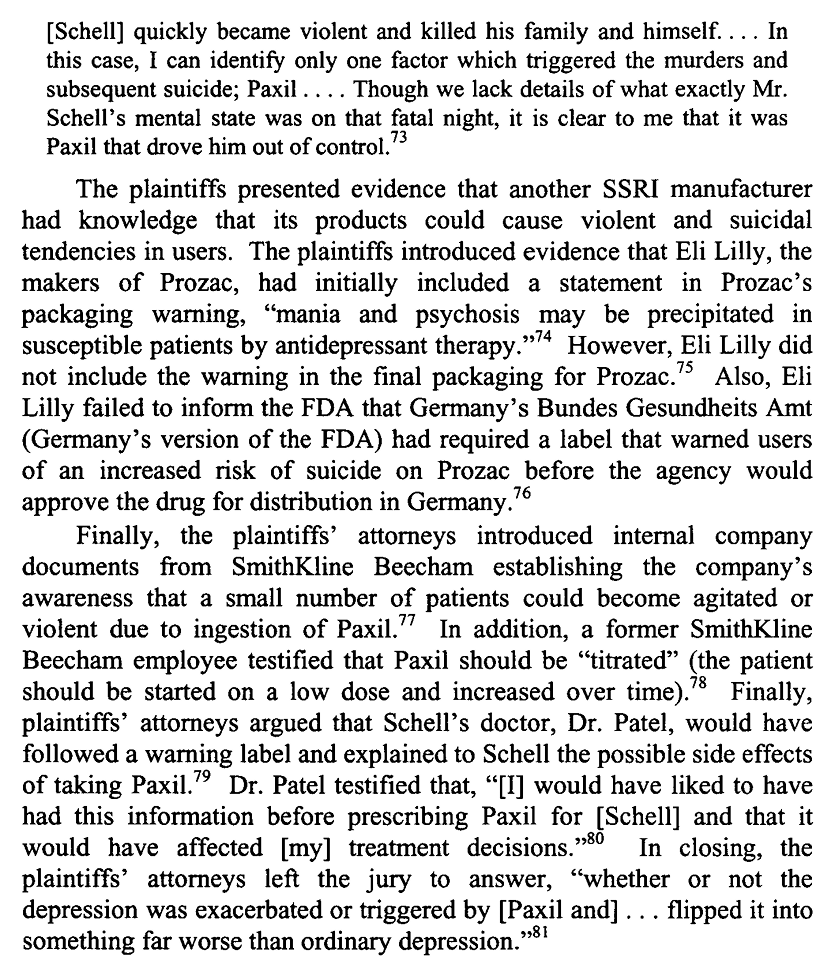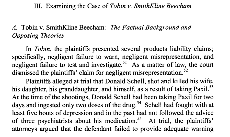 Things came to a climax at the Tobin v. SmithKline trial, where an individual shot and killed his wife, daughter, granddaughter, and himself after just two doses of Praxil, another SSRI drug. Finally, Pharma was held (somewhat) accountable, as the jury found for the plaintiff.