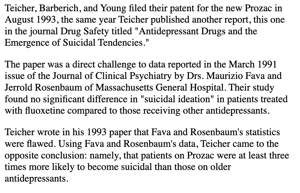 In 1990, shortly after Prozac’s approval, Harvard psychiatrist Martin H. Teicher reported that SSRIs could cause suicidal or homicidal tendencies. He described cases in disturbing, gory detail. It was clear that these individuals had their reality distorted.