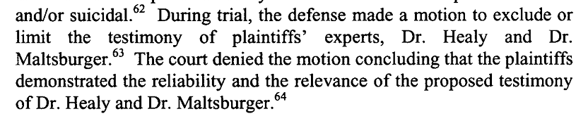 Doctors testified, saying that there was already a extensive existing literature on how SSRIs could cause suicidal or homicidal tendencies. They presented substantial evidence that both Lilly and SmithKline were well aware of this.