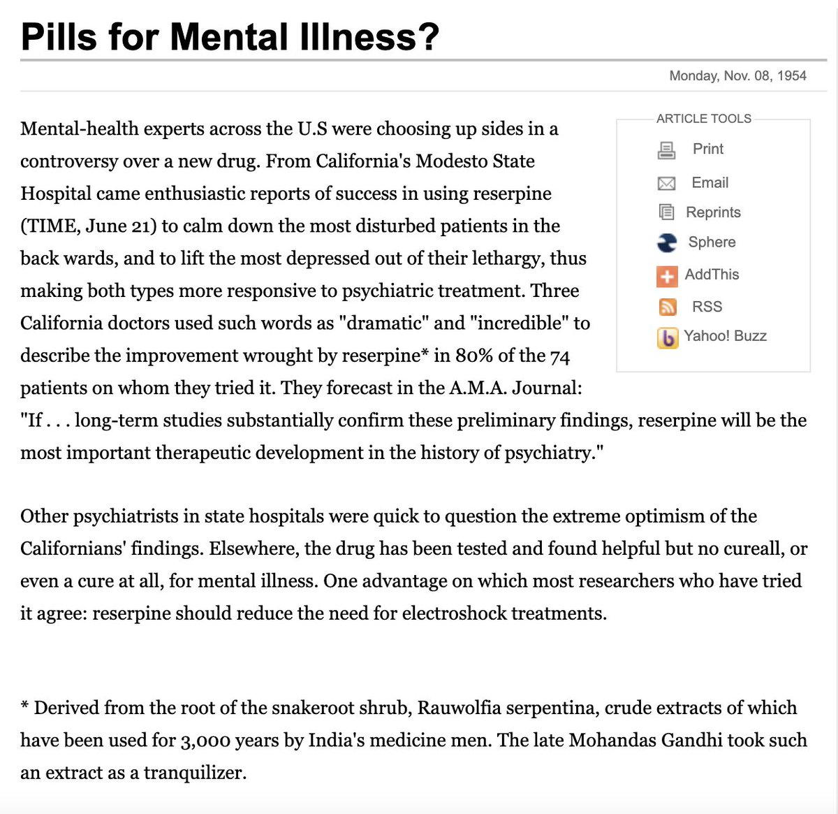 Reserpine, a drug that had been used for centuries by Indians. Even Ghandi used it. Reserpine works by inhibiting the release of all monoamines. Despite showing benefit in humans, the narrative became that it induced depression in animals due to its sedative properties.