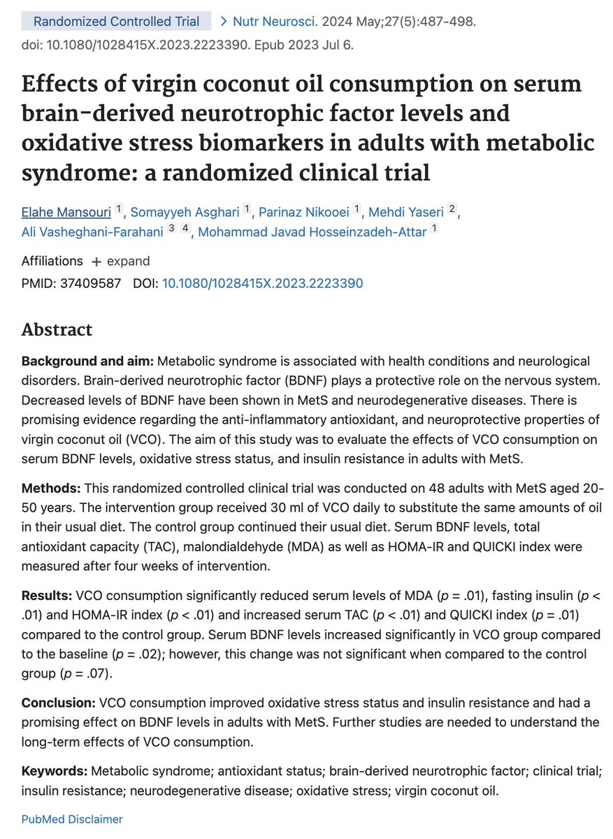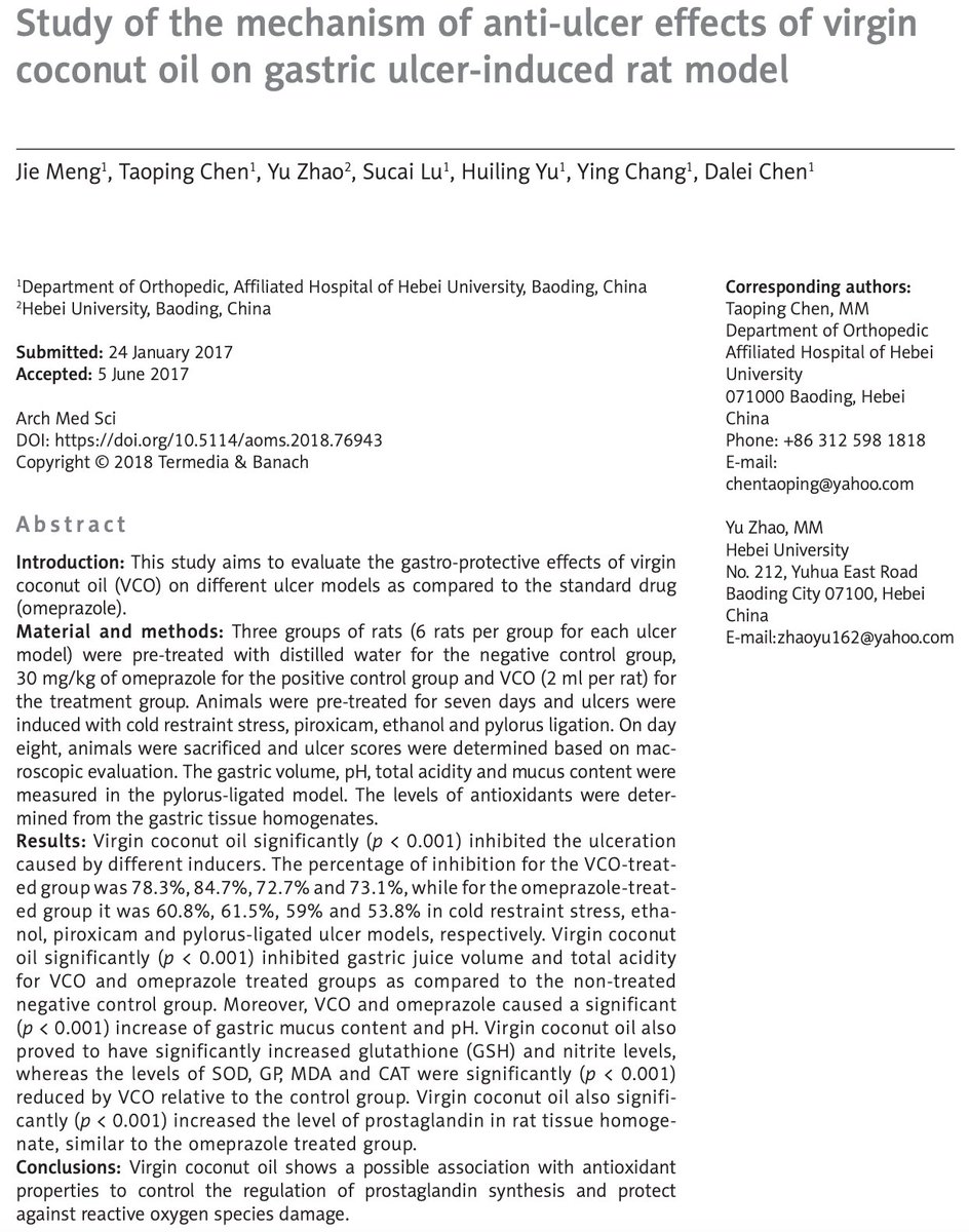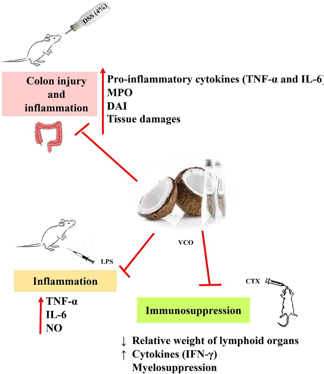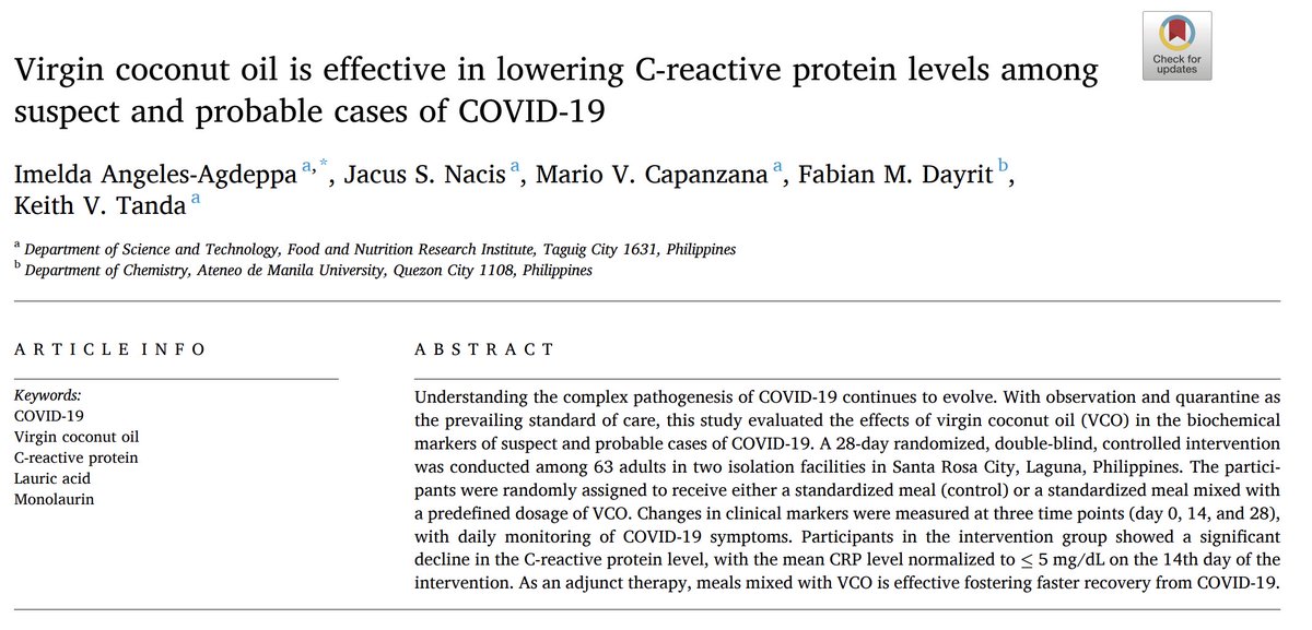 Coconut oil lowers inflammation in COVID, supports immunity. 3 tbsp / d for 28 days: • ↓ CRP • ↓IL-6 (inflammatory markers) • ↑ CD4+ T cells • ↑ Natural killer cell activity (immune cells) Monolaurin from coconut oil has direct antiviral properties.