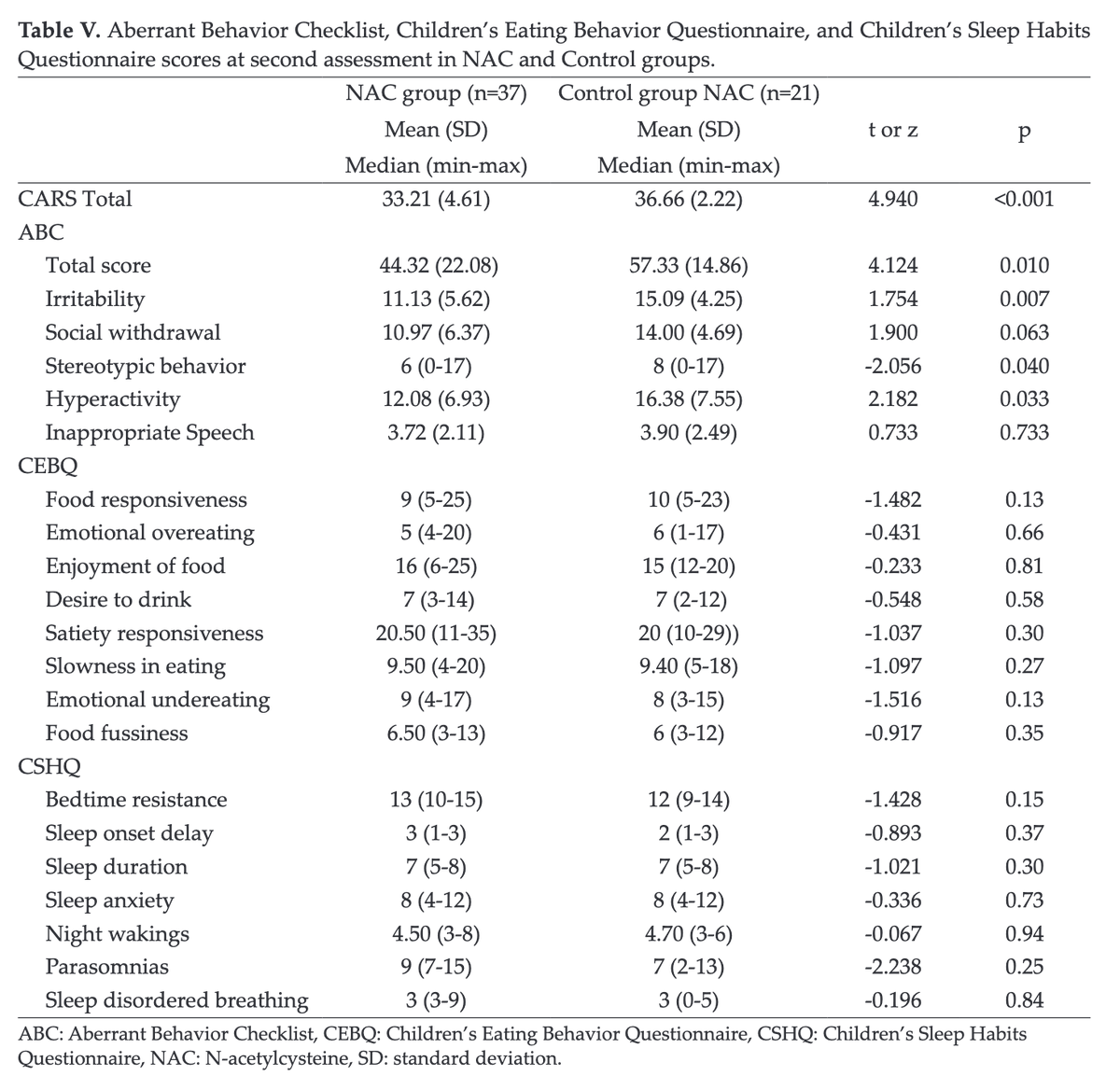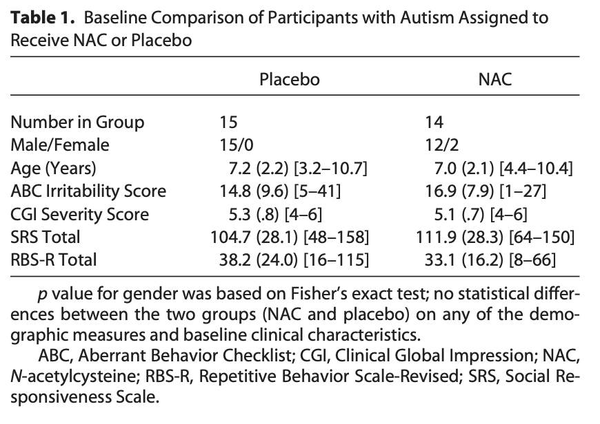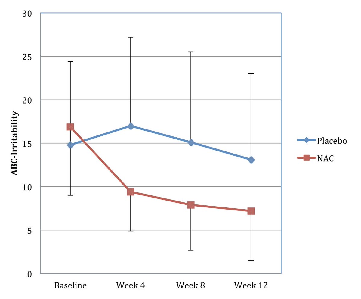 NAC even at these lower doses still showed benefits for autism. After 8 weeks: CARS Total ↓ (lower autism severity) ABC Total score ↓ (overall problem behaviors) ABC Irritability ↓ ABC Stereotypic behavior ↓ ABC Hyperactivity ↓ (7/9)