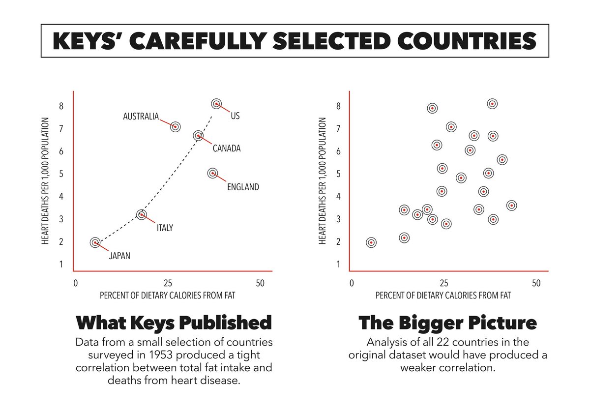 Saturated fats continued to face criticism when Ancel Keys cherry-picked data to support his diet-heart hypothesis in 1958.