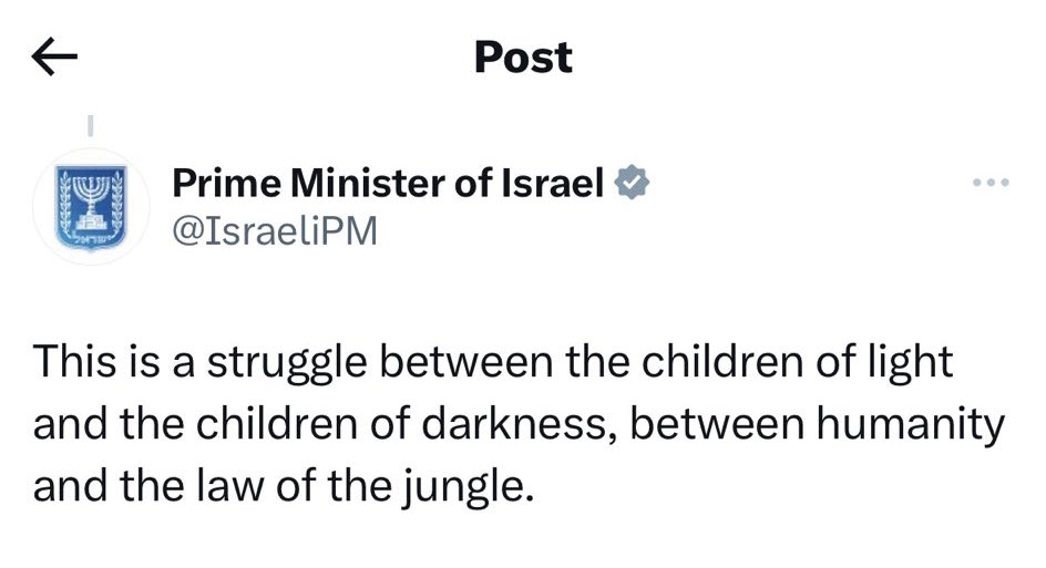 Netanyahou a twitté puis effacé son tweet qualifiant les Palestiniens "d'enfants des ténèbres vivant selon la loi de la jungle." "THE LAW OF THE JUNGLE" cette expression ne sort pas de nulle part... https://t.co/rM4M7vLkj3 https://t.co/dqDHLjmdNu