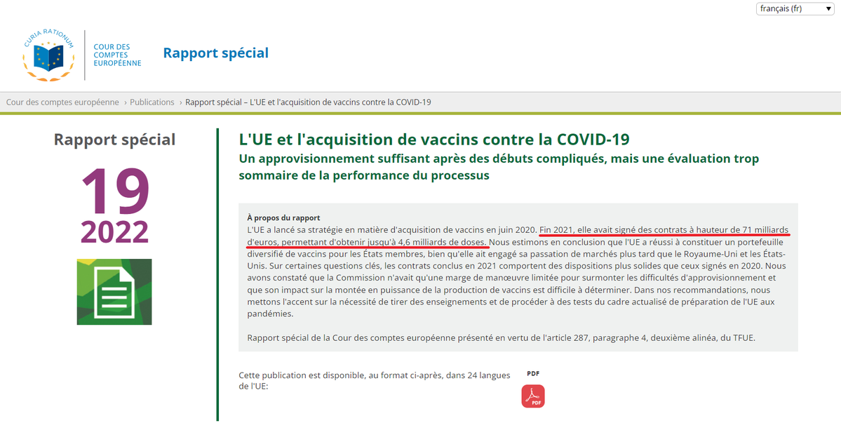 @CalliFanciulla Je ne sais pas d'où vient cette estimation de 1,5 milliard de doses achetées par l'UE mais elle est très en deçà de l'estimation faite par la cour des comptes 🇪🇺 dans son rapport de 2022 : 4,6 milliards de doses pour un montant de 71 milliards d'€ https://op.europa.eu/webpub/eca/special-reports/covid19-vaccines-19-2022/fr/