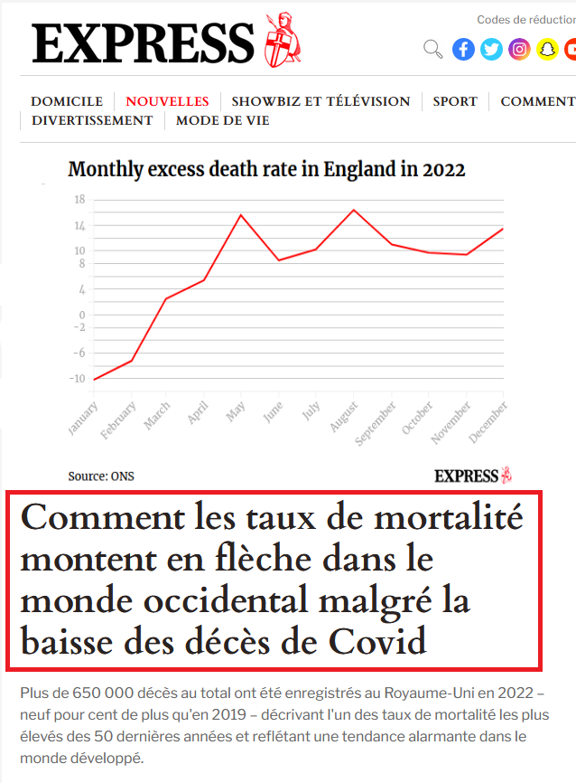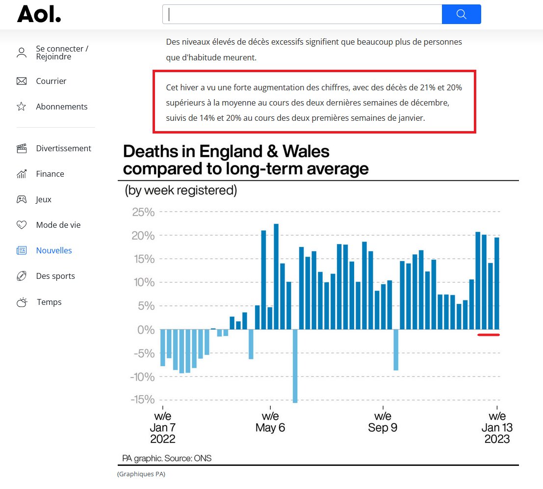 🏴 Angleterre et 🏴 Pays de Galles 17 janvier 2023 Yahoo! News & AOL "Depuis juin 2022, il y a eu 30 000 décès de plus que prévu" 20% et 21% de surmortalité fin décembre 2022 et 14% et 20% début janvier 2023. https://news.yahoo.com/why-are-so-many-more-people-dying-than-normal-170140075.html