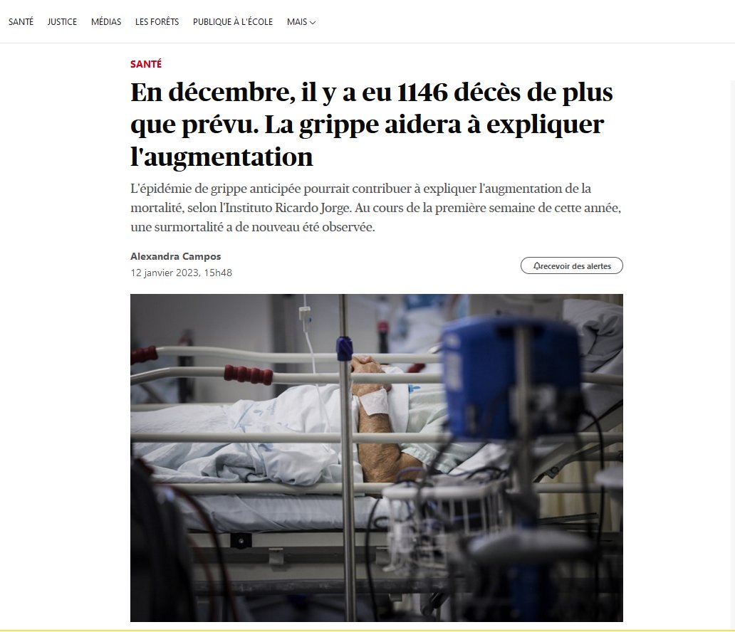 🇵🇹 Portugal 12 janvier 2023 Público 1146 décès en trop observés entre le 28 novembre et le 18 décembre 2022 (16% de surmortalité) "Au cours de la première semaine de cette année, une surmortalité a de nouveau été observée" https://www.publico.pt/2023/01/12/sociedade/noticia/epidemia-gripe-antecipada-ajuda-explicar-excesso-mortalidade-final-2022-2034778