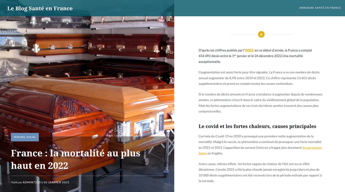 🇫🇷 France 10 janvier 2023 Le blog santé - INSEE 2022 : Une mortalité exceptionnelle. La France a vu son nombre de décès annuel augmenter de 8,9% entre 2019 et 2022. https://www.santeenfrance.fr/blog/france-la-mortalite-au-plus-haut-en-2022-2823