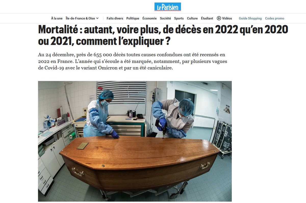 🇫🇷 France (bis) 9 janvier 2023 Le Parisien Mortalité : autant, voire plus, de décès en 2022 qu’en 2020 ou 2021 https://www.leparisien.fr/societe/mortalite-autant-voire-plus-de-deces-en-2022-quen-2020-ou-2021-comment-lexpliquer-09-01-2023-NQVDCYFINNHNPAWYTB4HV4ZGCM.php
