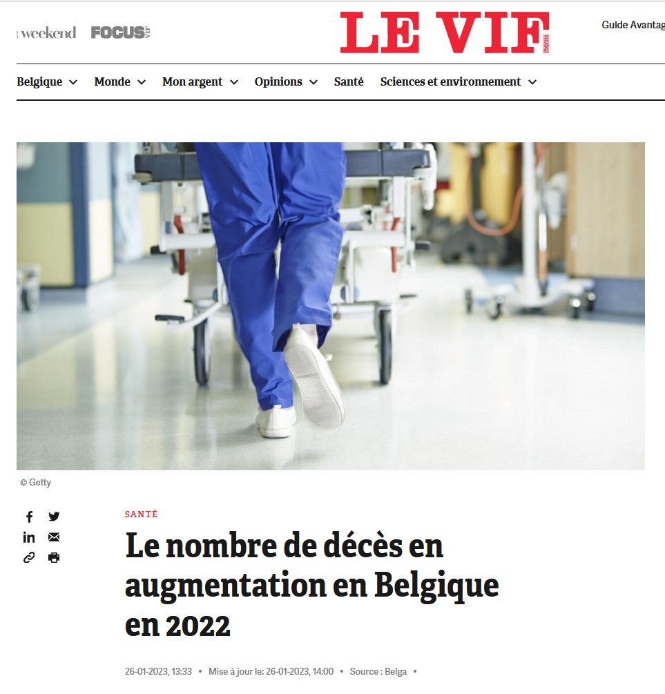 🇧🇪 Belgique 26 janvier 2023 Le Vif 6.000 décès supplémentaires en 2022 comparé à la moyenne des années 2017, 2018, 2019 et 2021 (2020 a été retirée pour cause de pandémie). https://www.levif.be/societe/sante/le-nombre-de-deces-en-augmentation-en-belgique-en-2022/