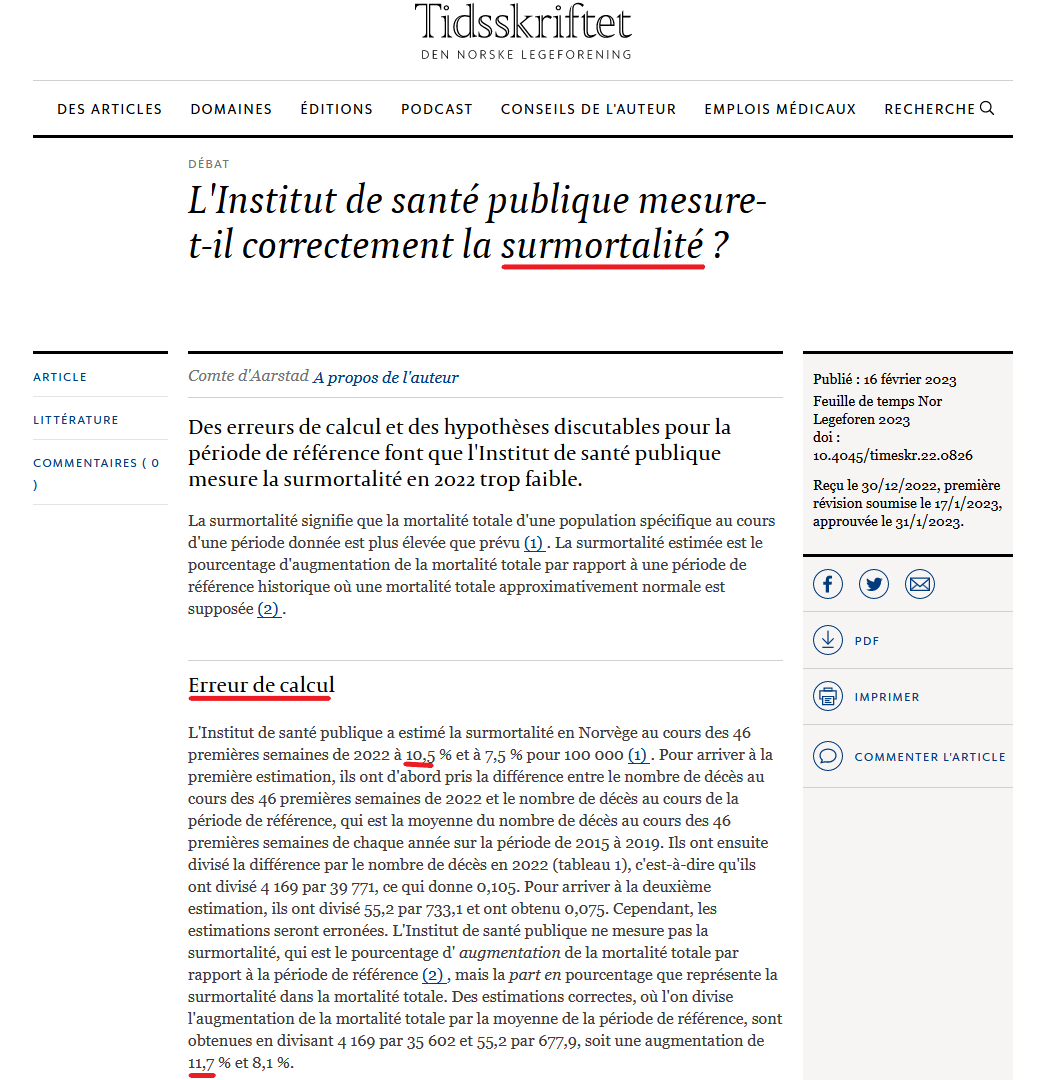 🇳🇴 Norvège 16 février 2023 Tidsskriftet Jarle Aarstad, docteur en économie, critique les méthodes de calcul du taux de surmortalité par l'Institut de santé publique norvégien. L'Institut l'estime à 10,5% Le Dr Aarstad à 11,7% https://tidsskriftet.no/2023/02/debatt/maler-folkehelseinstituttet-overdodelighet-riktig