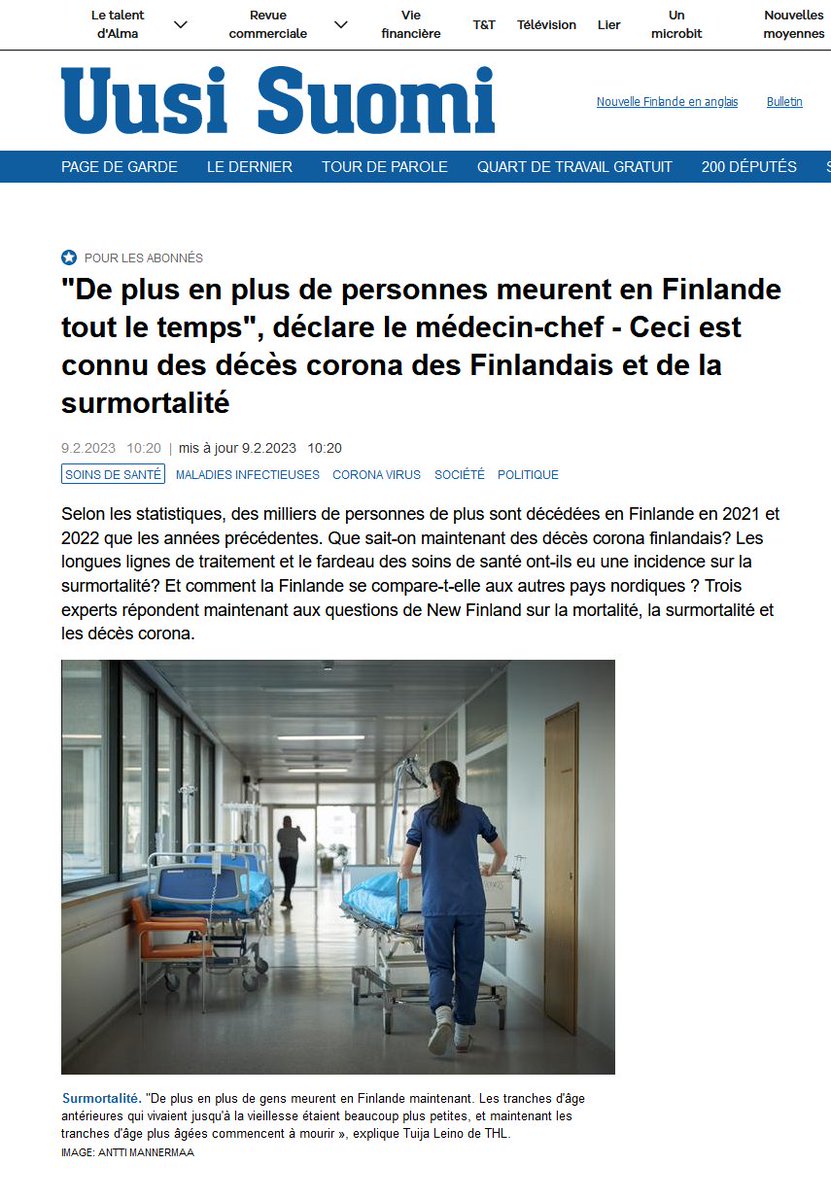 🇫🇮 Finlande 9 février 2023 Uusi Suomi "Selon les statistiques, des milliers de personnes de plus sont décédées en Finlande en 2021 et 2022 que les années précédentes." Et 2022 est bien pire que 2021 ! https://www.uusisuomi.fi/uutiset/suomessa-kuolee-nyt-koko-ajan-enemman-vakea-sanoo-ylilaakari-tama-tiedetaan-suomalaisten-koronakuolemista-ja-ylikuolleisuudesta/bfa06146-f347-44b9-865e-b554ed61e5c0