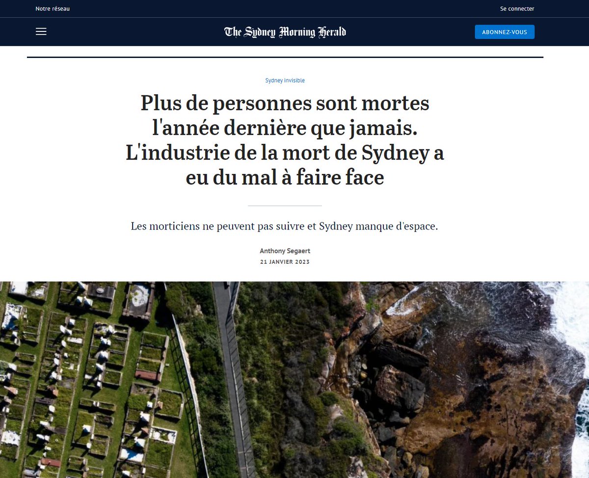 🇦🇺 Australie 21 janvier 2023 The Sidney Morning Herald Plus de personnes sont mortes en 2022 que jamais auparavant. L'industrie du décès de Sydney a eu du mal à faire face. https://www.smh.com.au/national/nsw/more-people-died-last-year-than-ever-before-sydney-s-death-industry-has-struggled-to-cope-20220922-p5bk9b.html
