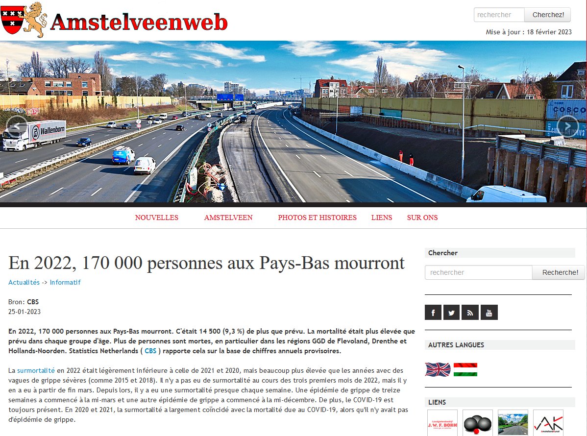 🇳🇱 Pays-Bas 25 janvier 2023 Amstelveenweb 2022 : 14500 décès de + que prévu (+9,3%). La mortalité était plus élevée que prévu dans chaque groupe d'âge, beaucoup plus élevée que les années avec des vagues de grippe sévères (comme 2015 et 2018). https://amstelveenweb.com/nieuws-In-2022-overleden-170-000-mensen-in-Nederland